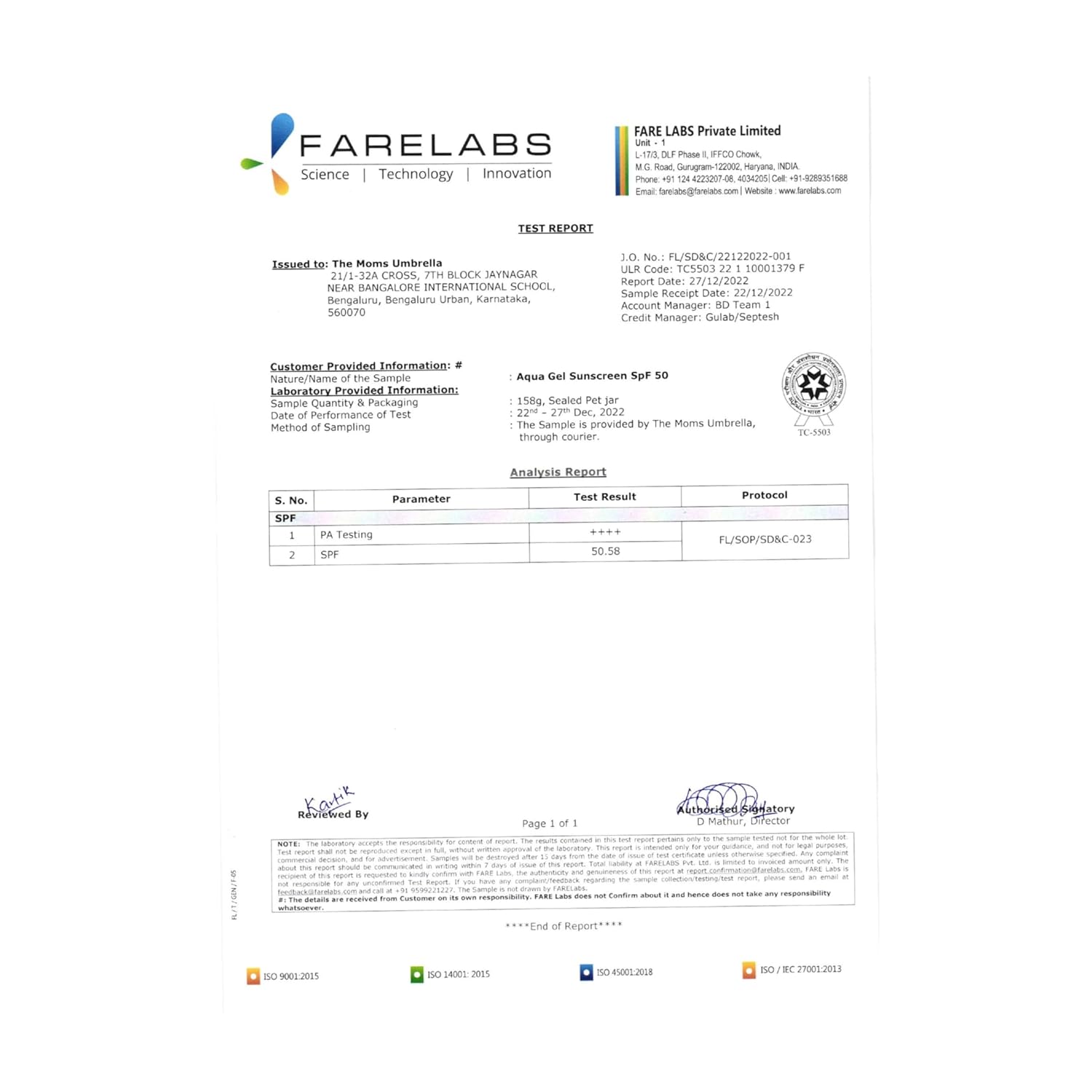 | Sun Protection Factor | 50 Sun Protection Factor (SPF) |